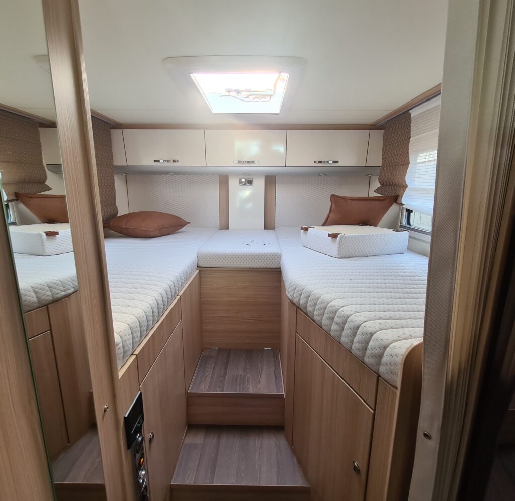 De badkamer is royaal en biedt een wasbak, cassette toilet en een douchegelegenheid. De slaapruimte bestaat uit enkele lengte bedden met lattenbodem voor een comfortabele nachtrust, en veel opbergruimte rondom en onder het bed.